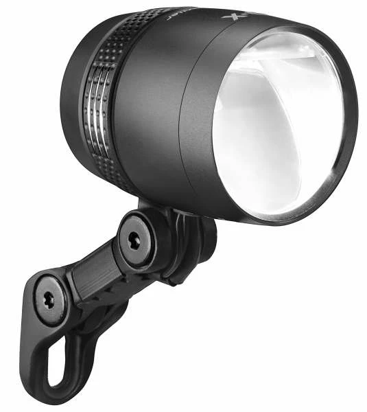 Der IQ-X von Busch + Müller. Seine neu entwickelte Lichttechnologie macht es erstmals möglich, mit einem Dynamoscheinwerfer die 100-Lux-Marke zu knacken – und das mit einer sehr breiten, weiten und homogenen Großflächen-Ausleuchtung der Straße. Zur HighEnd-Technik gesellt sich beim IQ-X auch Design: Das Gehäuse, das auch als Kühlungssystem dient, besteht aus hochwertigem Aluminium, wahlweise silber oder schwarz. Hell zur Seite abstrahlende Schlitze im Halterring setzen Sichtbarkeits-Akzente, während der ergonomische Bedientaster in einen blau leuchtenden Ring eingebettet ist.