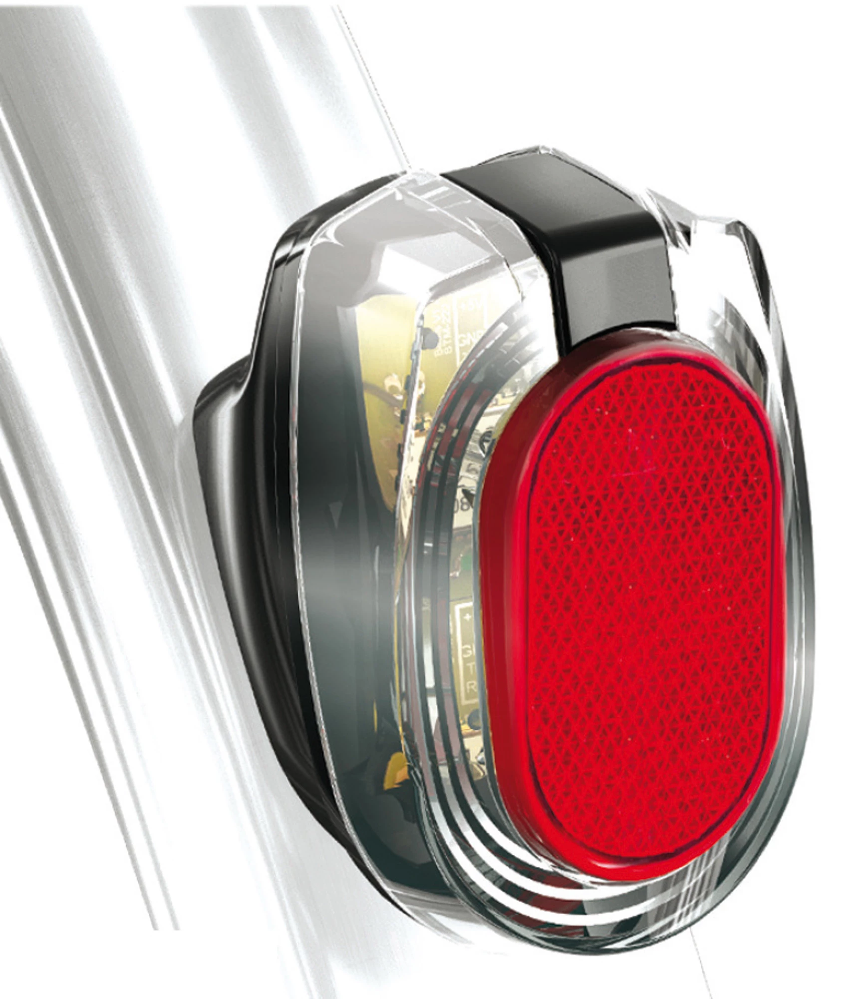 Das LineTec-Prismensystem mit seiner eleganten Klarglas-Optik ist als Kranz um den Rückstrahler gelegt. Es leuchten rote Lichtkreise strahlend hell. Die aktive Signalisationsfläche ist extrem groß, obwohl das Rücklicht in der Form selbst äußerst zierlich ist.